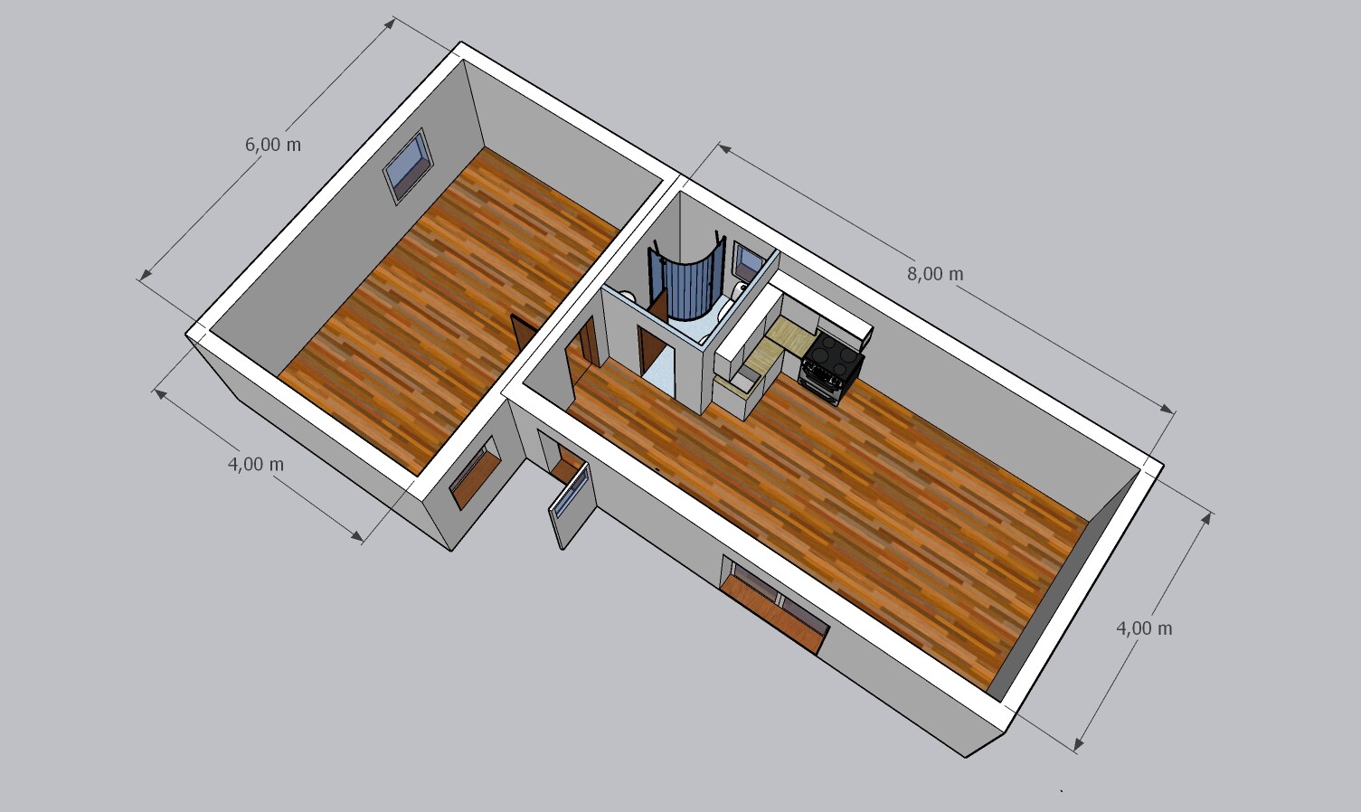 Rozvržení: 1 ložnice, obývací pokoj s kuchyňským koutem, koupelna, WC