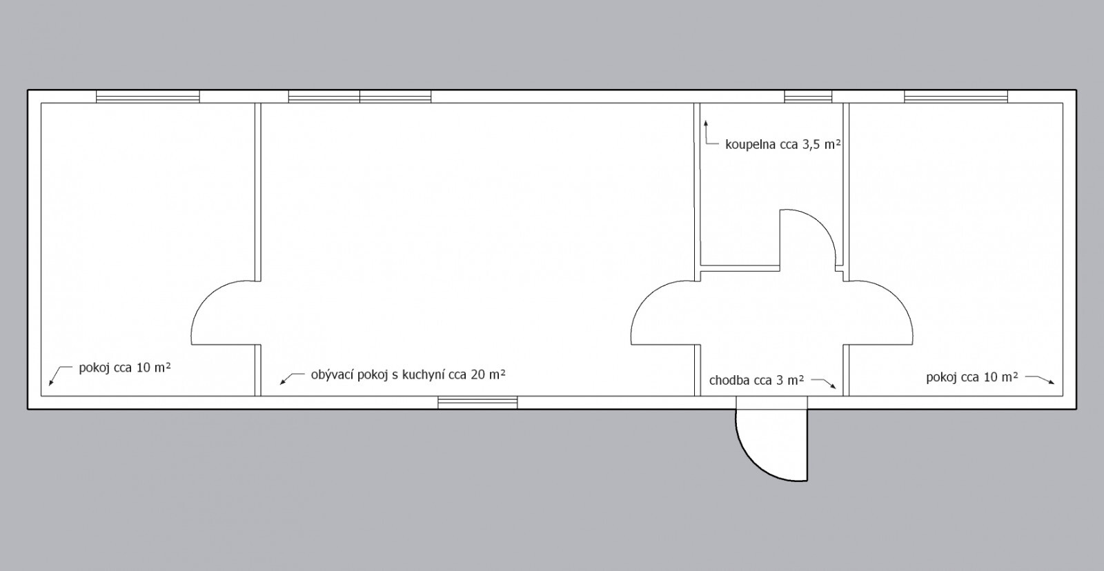 Rozměry: 13,19 x 4,19 (cca 55m2)