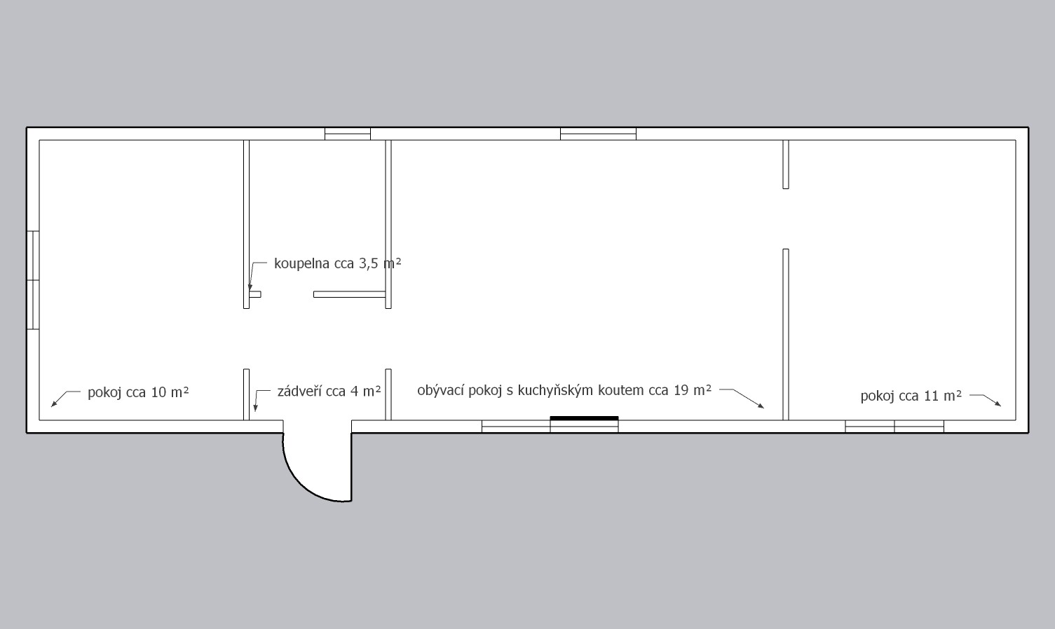 Rozvržení: 2 ložnice, obývací pokoj s kuchyňským koutem, koupelna, WC