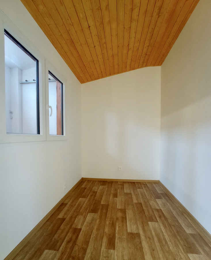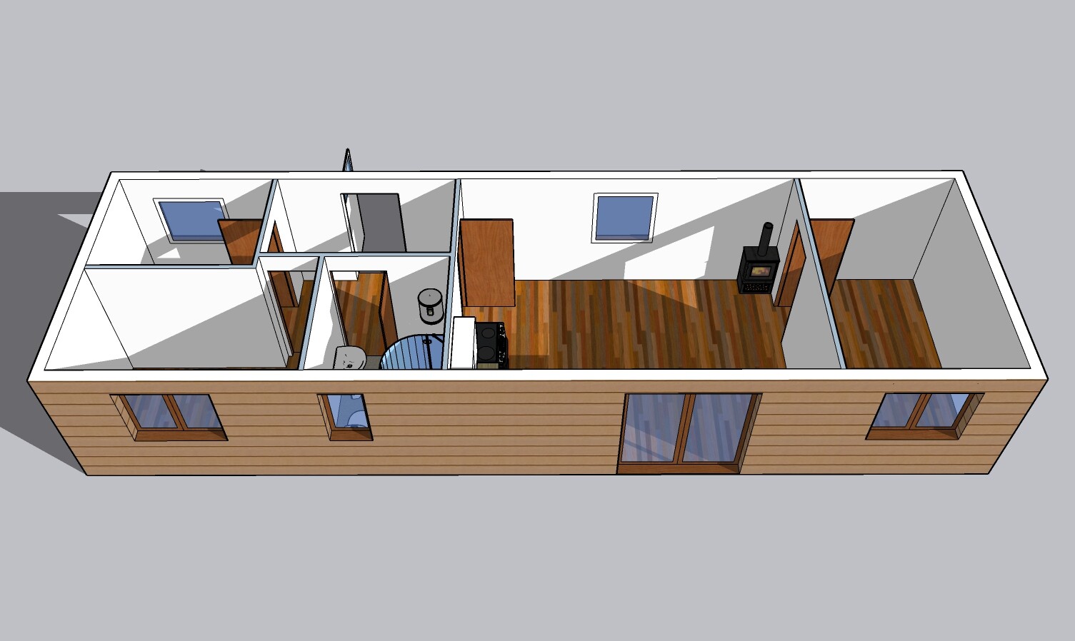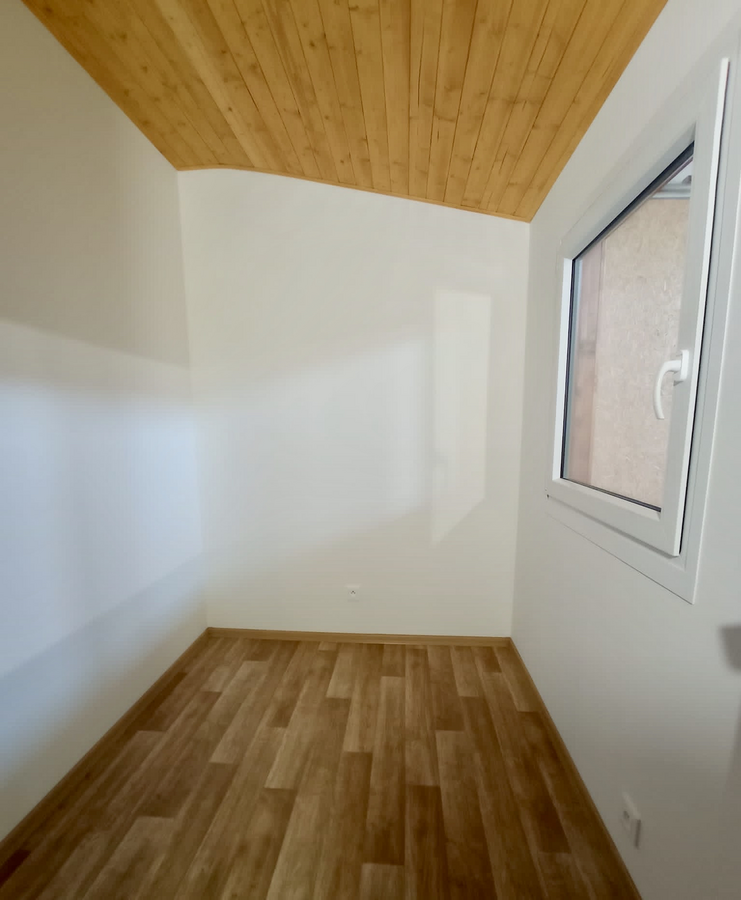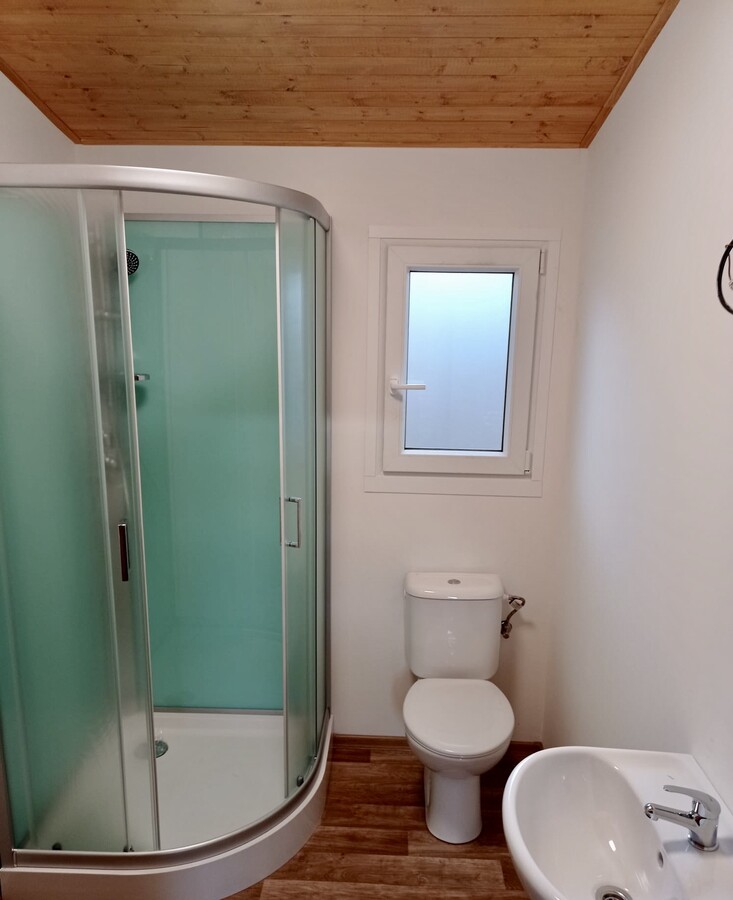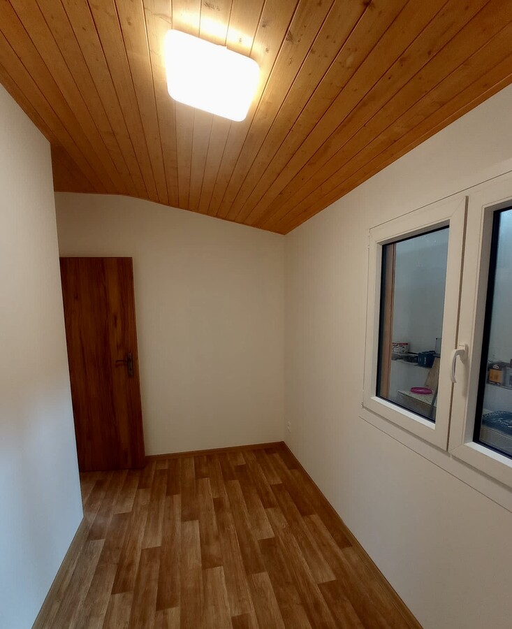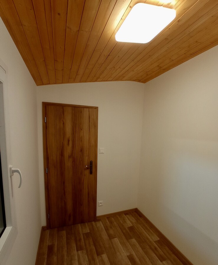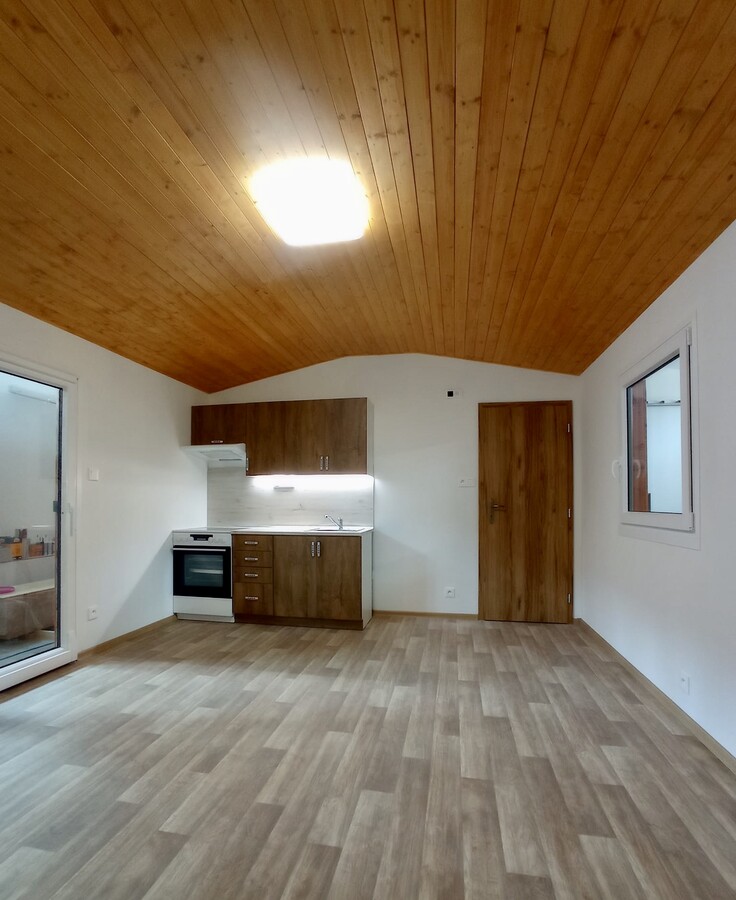 Výbava: Nový mobilheim, dřevěný obklad, vnitřní stěny sádrokarton, strop dřevěný obklad, podlaha zátěžové lino, kuchyně (dřez, digestoř, varná deska s troubou), koupelna (WC, umyvadlo, sprchový box, bojler 80l), síla vnějších stěn cca 17 cm (minerální vata), podlahy cca 15 cm (minerální vata), střechy cca 24 cm (minerální vata)