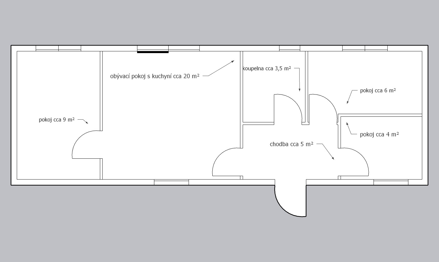 Rozvržení: 3 pokoje, bývací pokoj s kuchyňským koutem, koupelna, WC